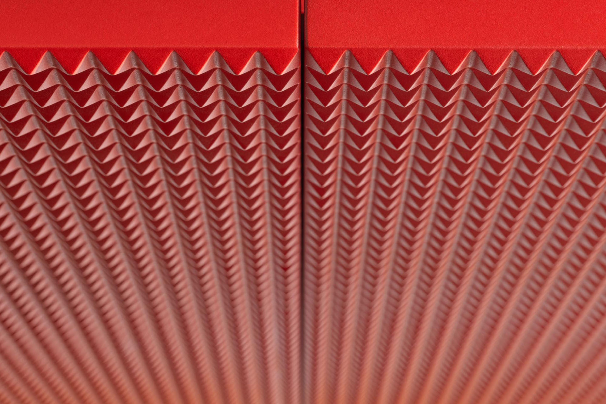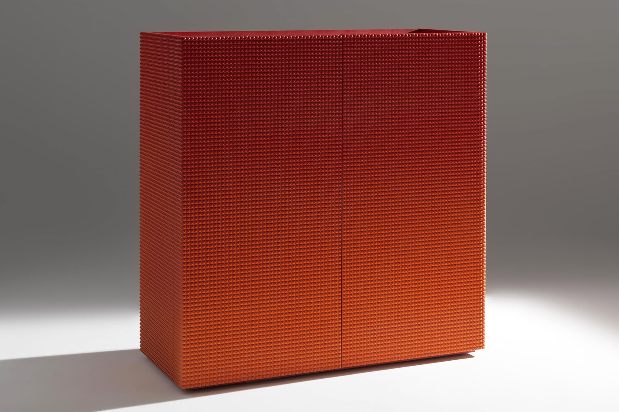 Mobile porta TV con due ante con apertura sui fianchi ed anta ribalta centrale. Schienalefinitoperutilizzoa centro stanza. Foro passacavi Top in cristallo retroverniciato; nella versione laccata satinata bianco, nero,rosso albedo o colore RAL, il mobile è realizzato in MDF; la finitura “a piramidi” è carteggiata a mano prima della laccatura finale. In opzione ante e fianchi con finitura foglia oro, prezzo a richiesta. Basamento in metallo verniciato nero H10 cm.
