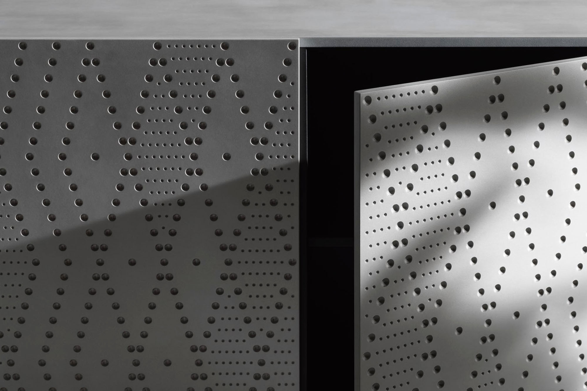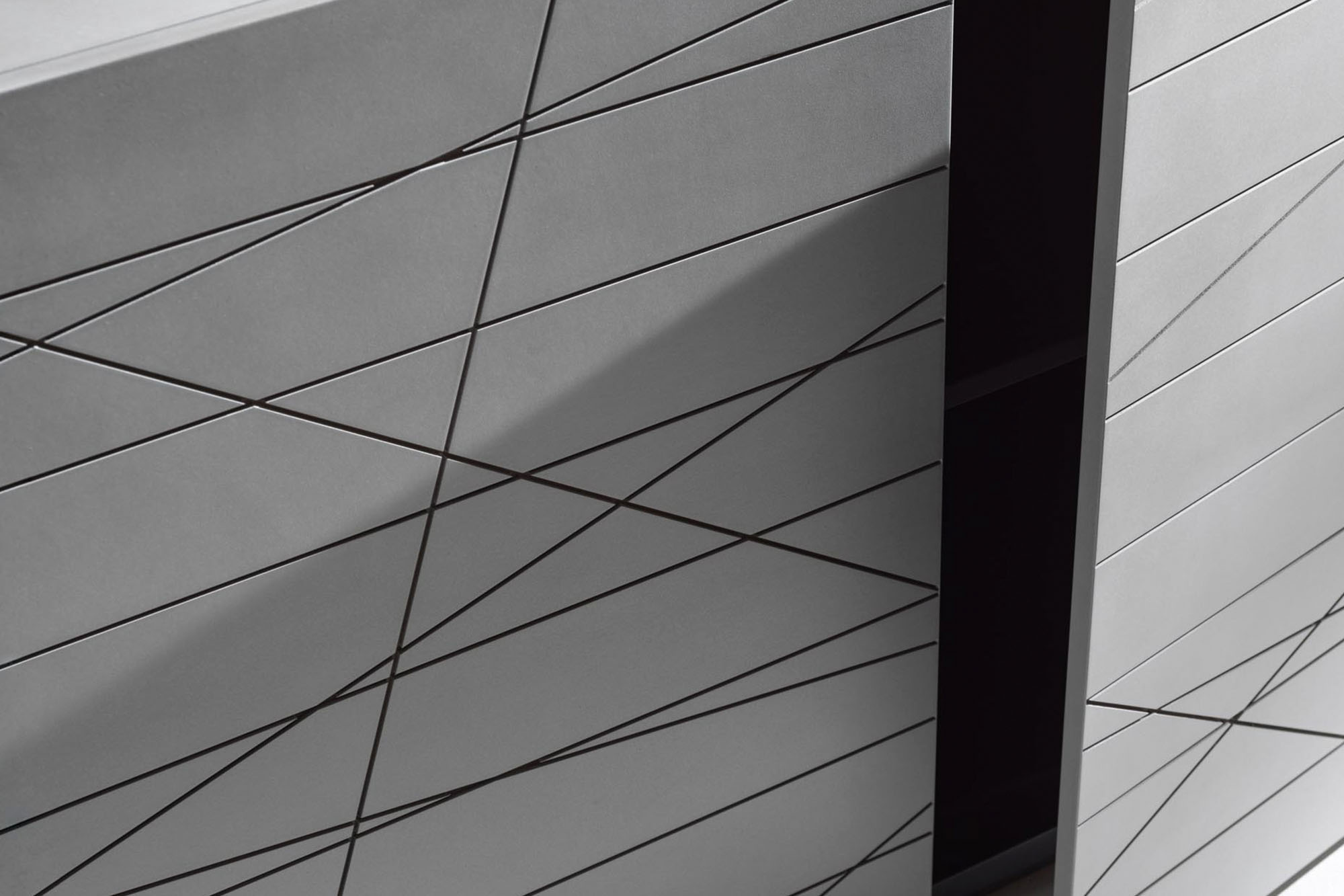 Contenitore verticale con 6 ante e un cassetto centrale, interno con ripiani in massello e vetro, la decorazione delle ante di spessore variabile permette un’apertura a combinazione ludica molto originale e divertente. Finiture della madia con possibilità di combinazione tra il legno e la finitura metallo.