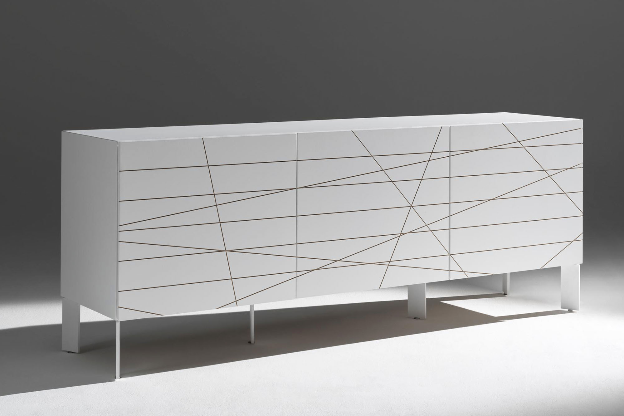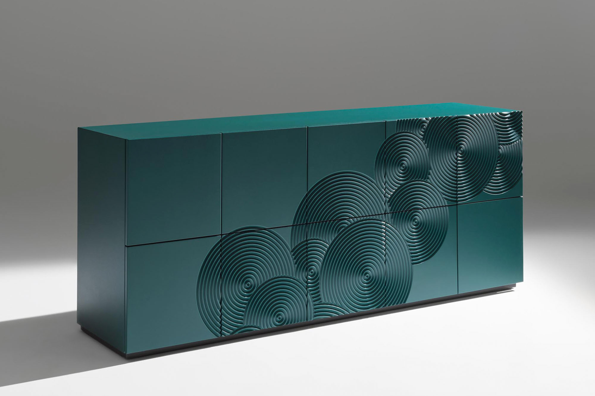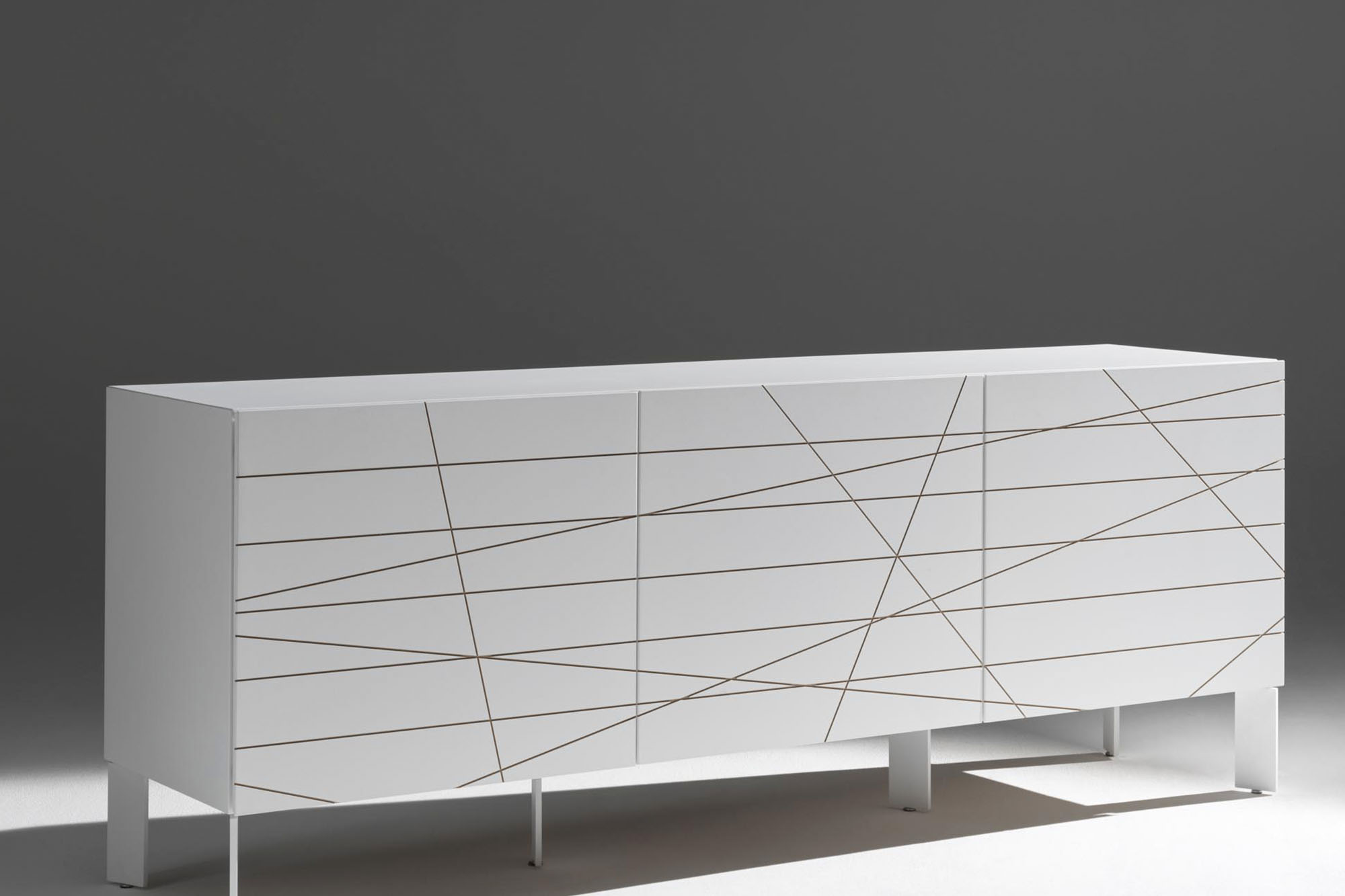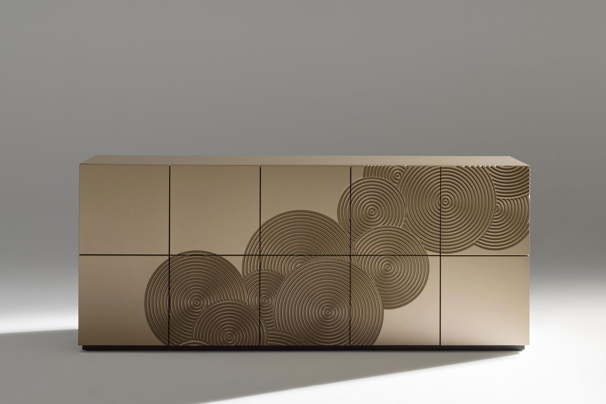 Madia 8 ante realizzata in MDF laccato con decoro inciso e rifinito a mano.