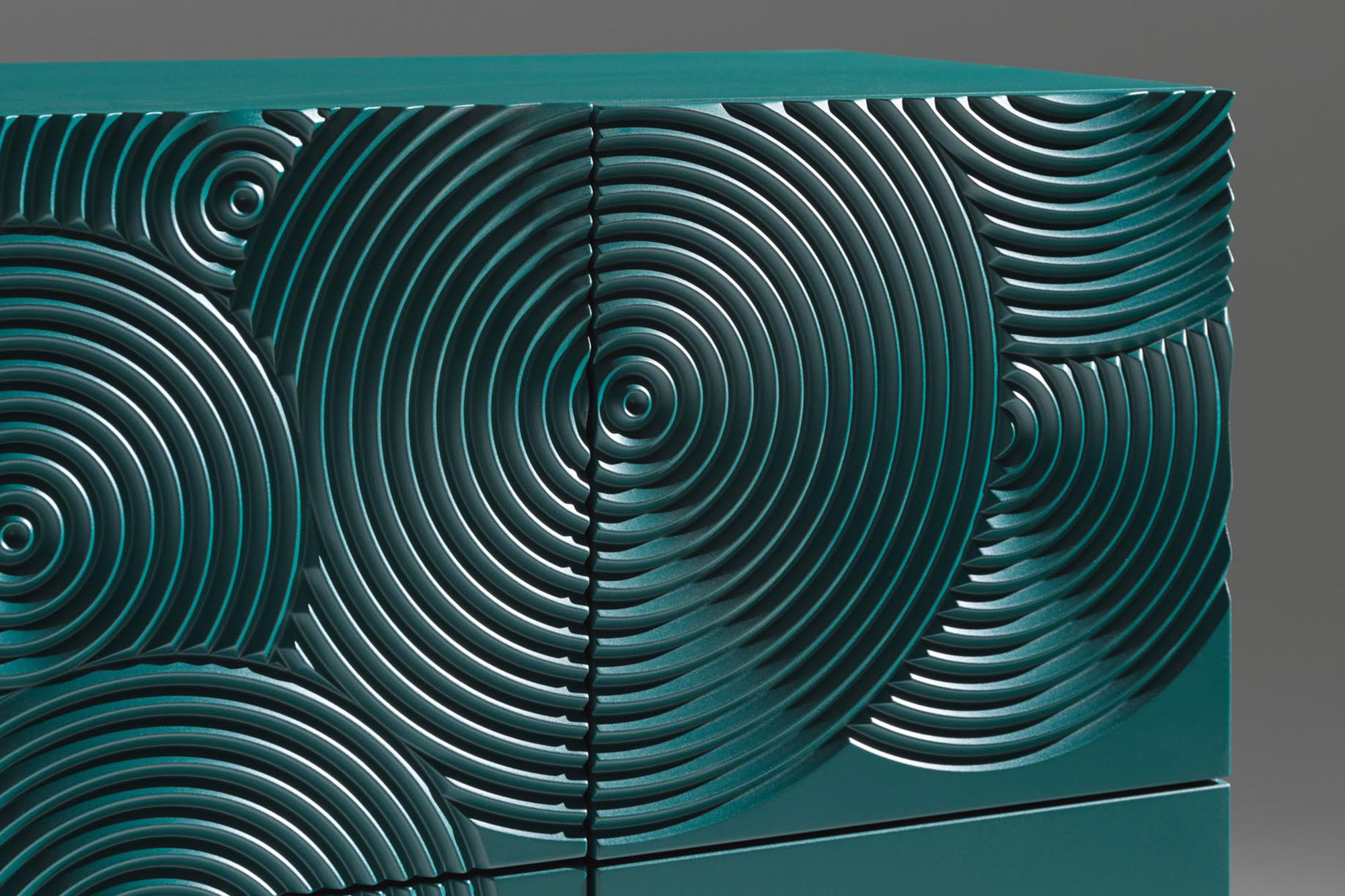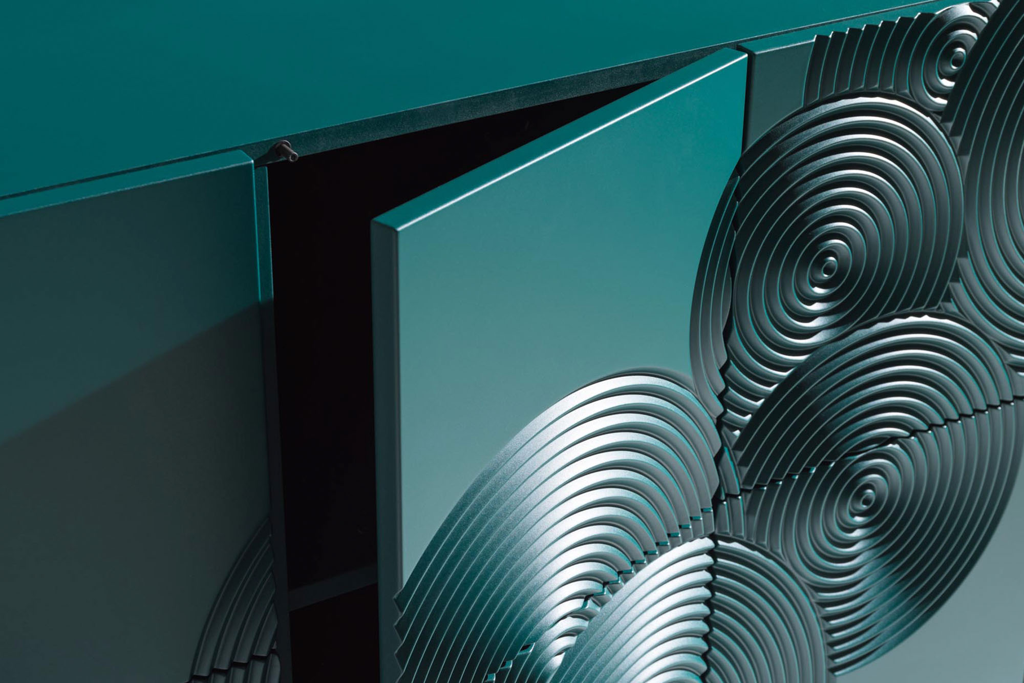 Madia 5 ante realizzata in MDF laccato con decoro inciso e rifinito a mano.