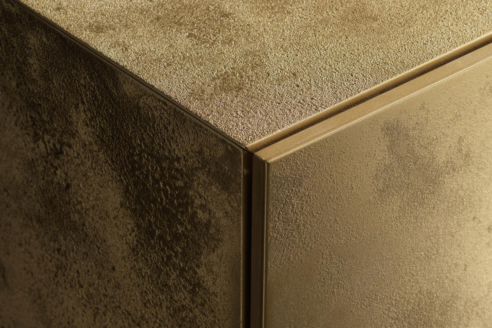 2 ante laterali e 2 cassettoni estraibili centrali da 120 cm. Finitura speciale metallo verniciato in versione corten, bronzo, rame verde, oro spazzolato e striped delabre brass. Possibilità di personalizzare la madia con combinazione tra il legno e la finitura metallo. Nel caso di personalizzazioni il corpo rimane sempre frassino tinto moca ed i frontali cambiano. Ripiani interni in cristallo temperato. È possibile montare una base in metallo finitura bronzo o nero.