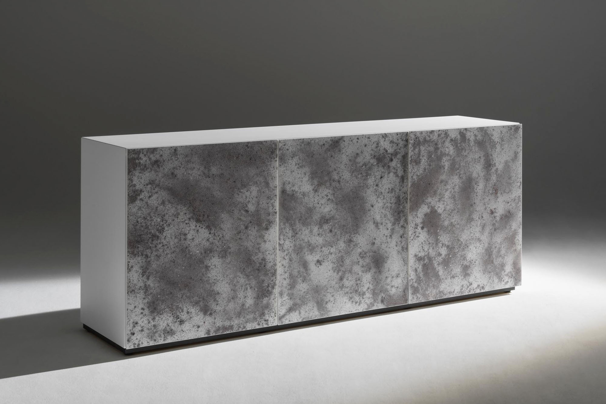 Mobile contenitore con struttura in agglomerato ligneo laccato nero o bianco e con un ripiano interno per vano. Ante e basamento realizzate in frassino termotrattato con intarsi finiti a mano.