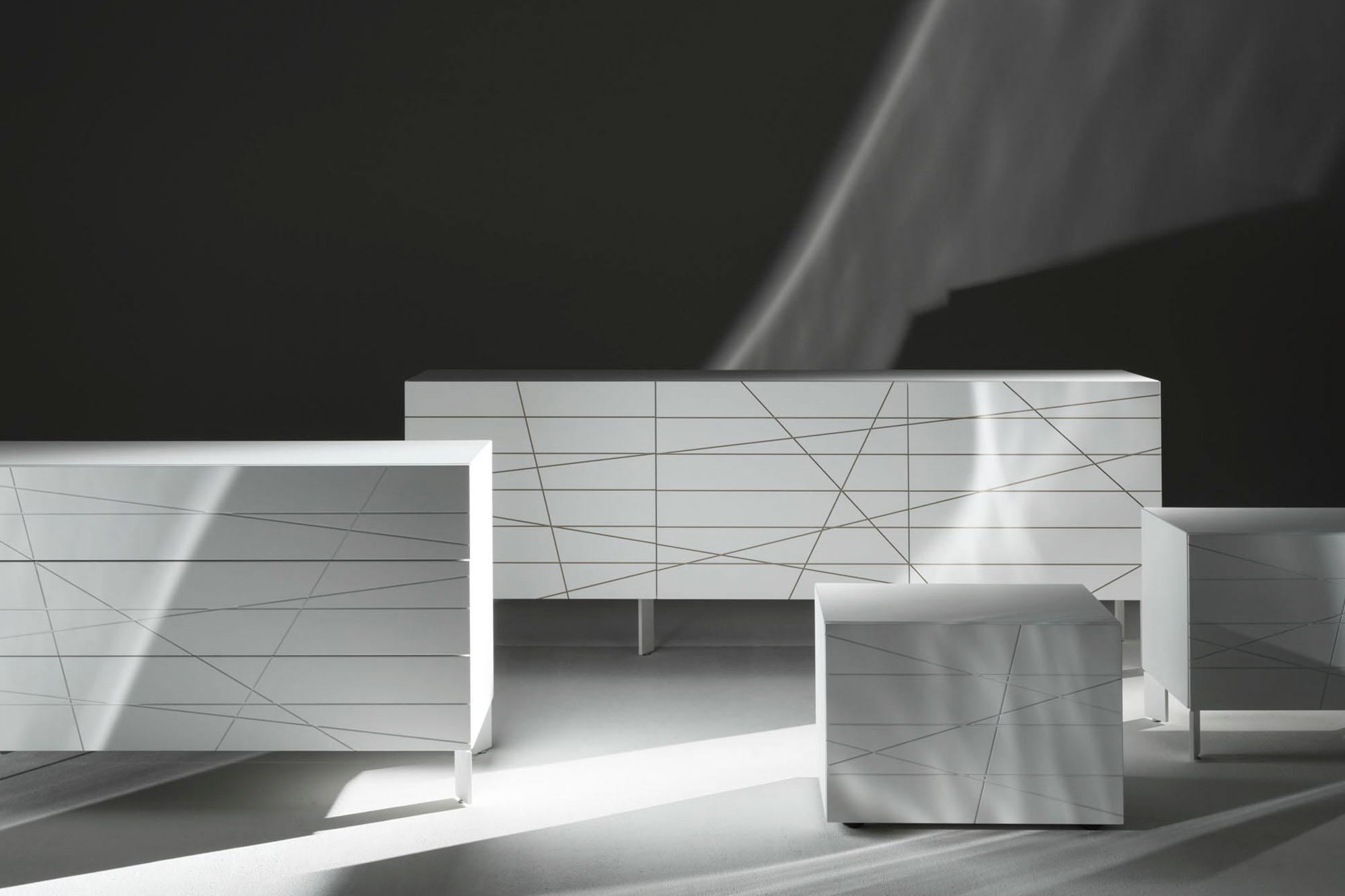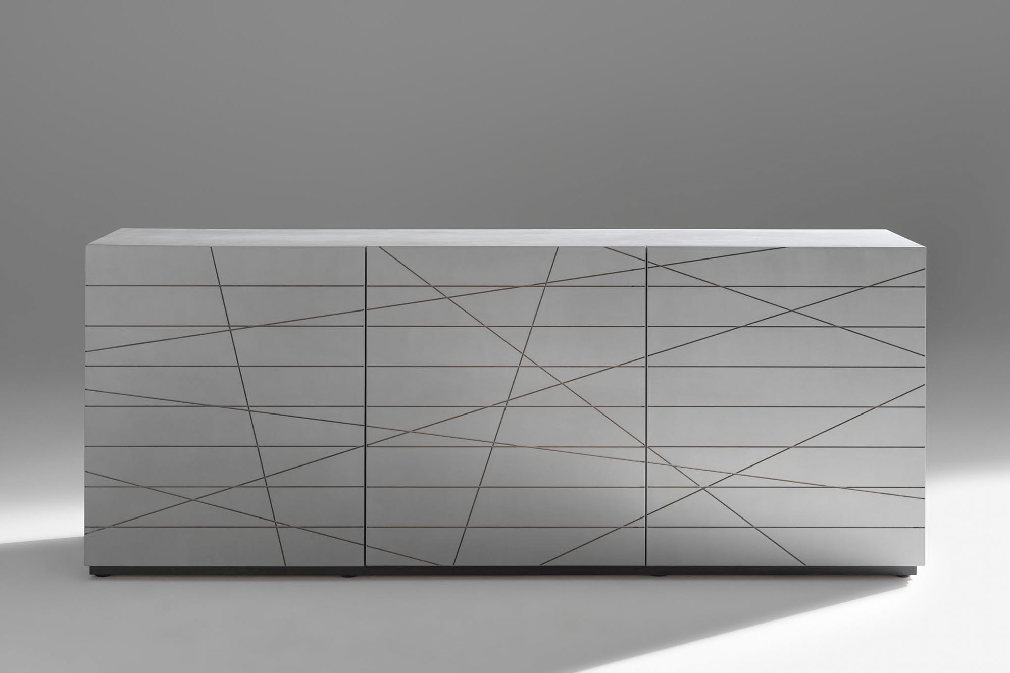 Top in cristallo retroverniciato; nella versione laccata satinata bianco, nero, o colore RAL, il mobile è realizzato in MDF; la finitura “a righe” è carteggiata a mano prima della laccatura finale.