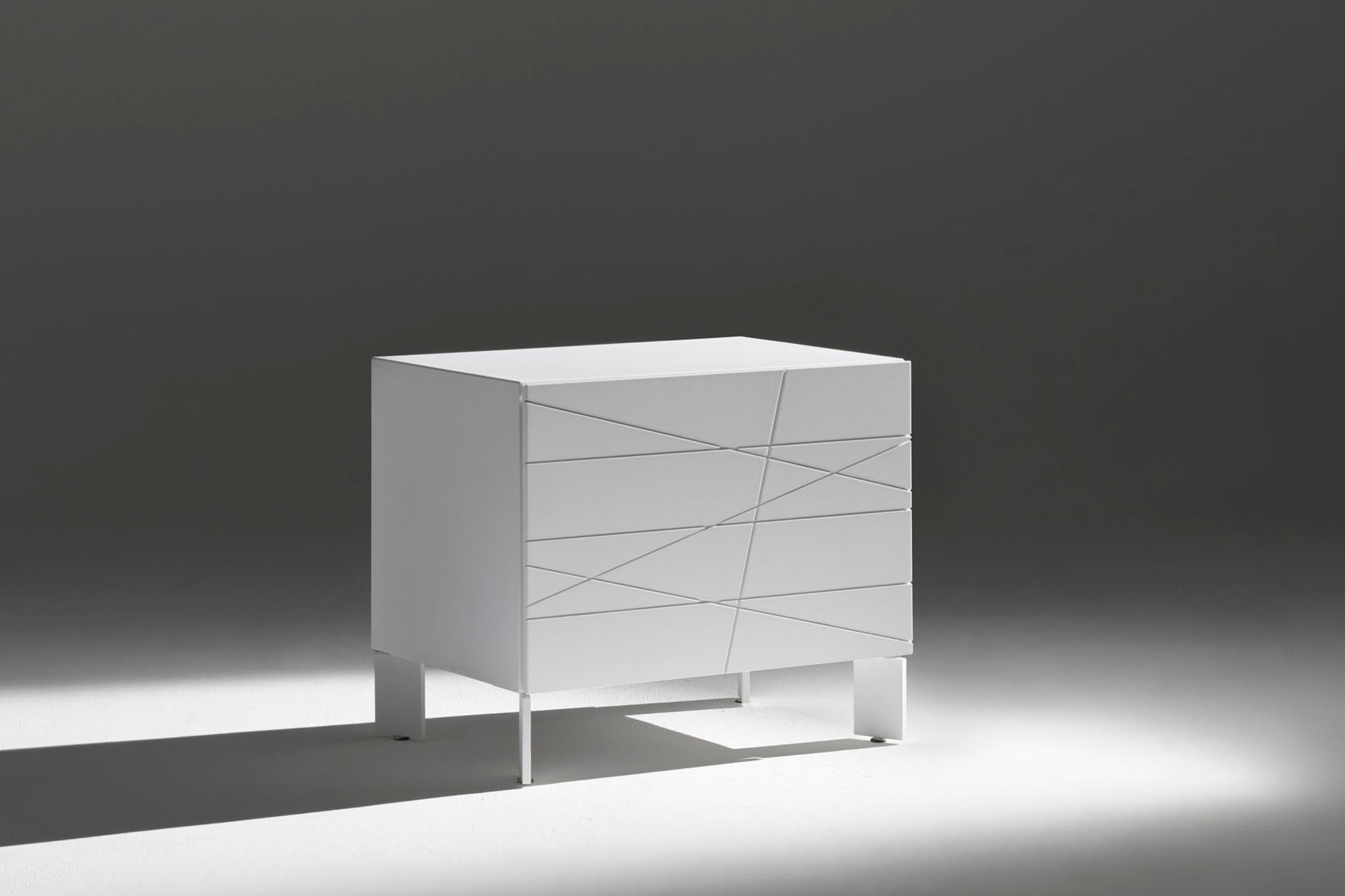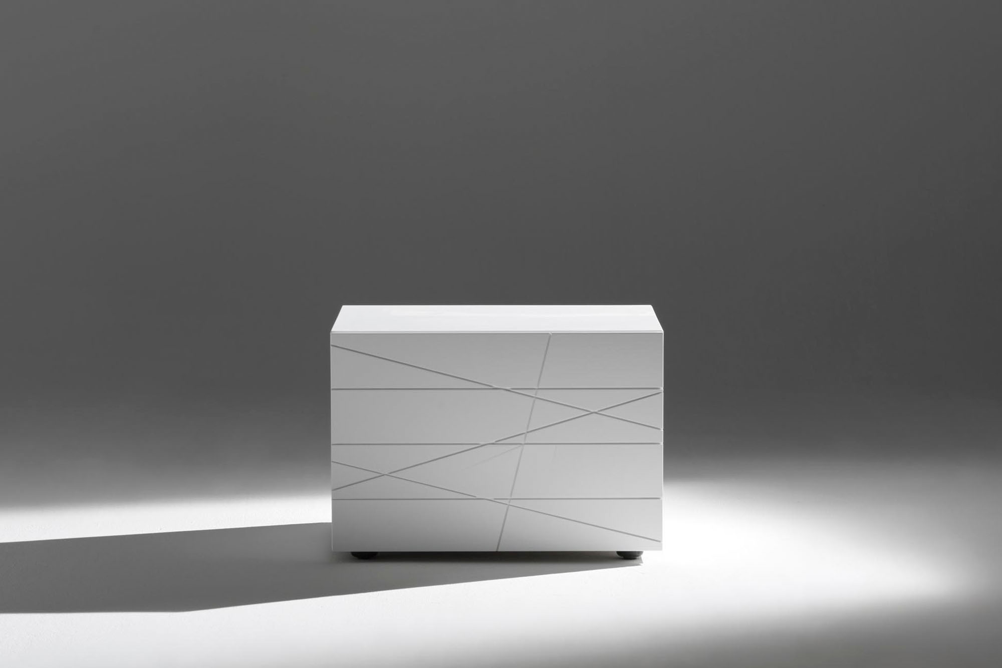 Comodino a 1 cassetto con vassioio interno optional. Struttura realizzato in agglomerato ligneo verniciato, frontale in mdf verniciato con vernici poliuretaniche / acriliche in base alle particolari finiture. Piedi optional registrabili in metallo verniciato.
