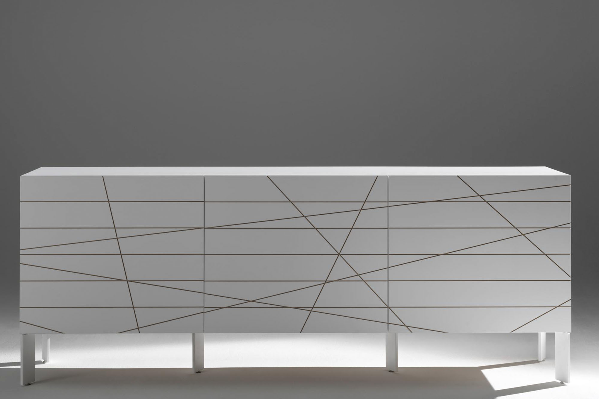 Credenza a due, tre o quattro ante con apertura sui fianchi con cerniere incassate; schienale finito per utilizzo a centro stanza.