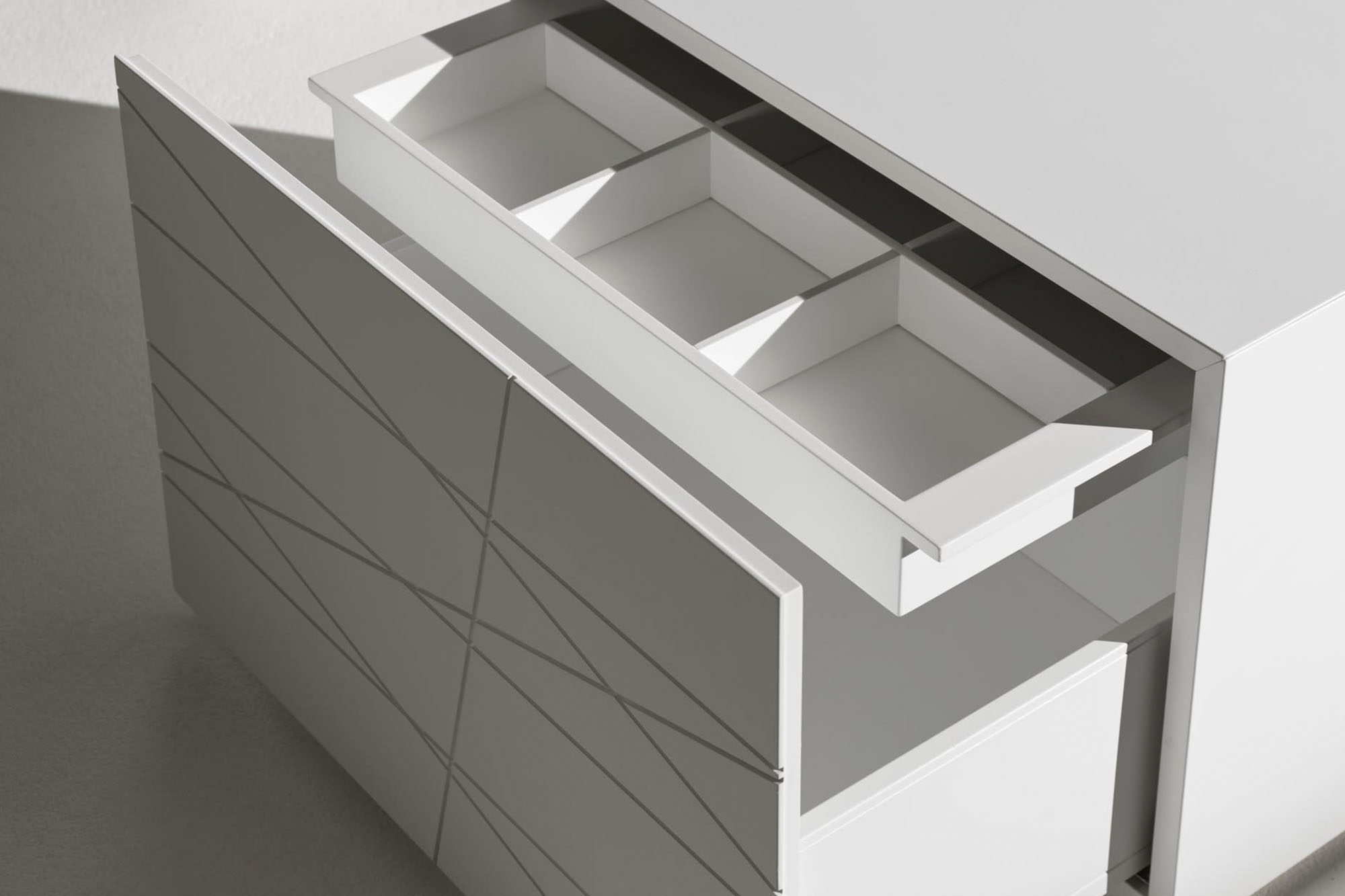 Struttura in agglomerato ligneo fibroso a basso peso specifico laccato, ante in mdf laccato con inserti in legno, cassetti con guide push-pull e sponde metalliche.
